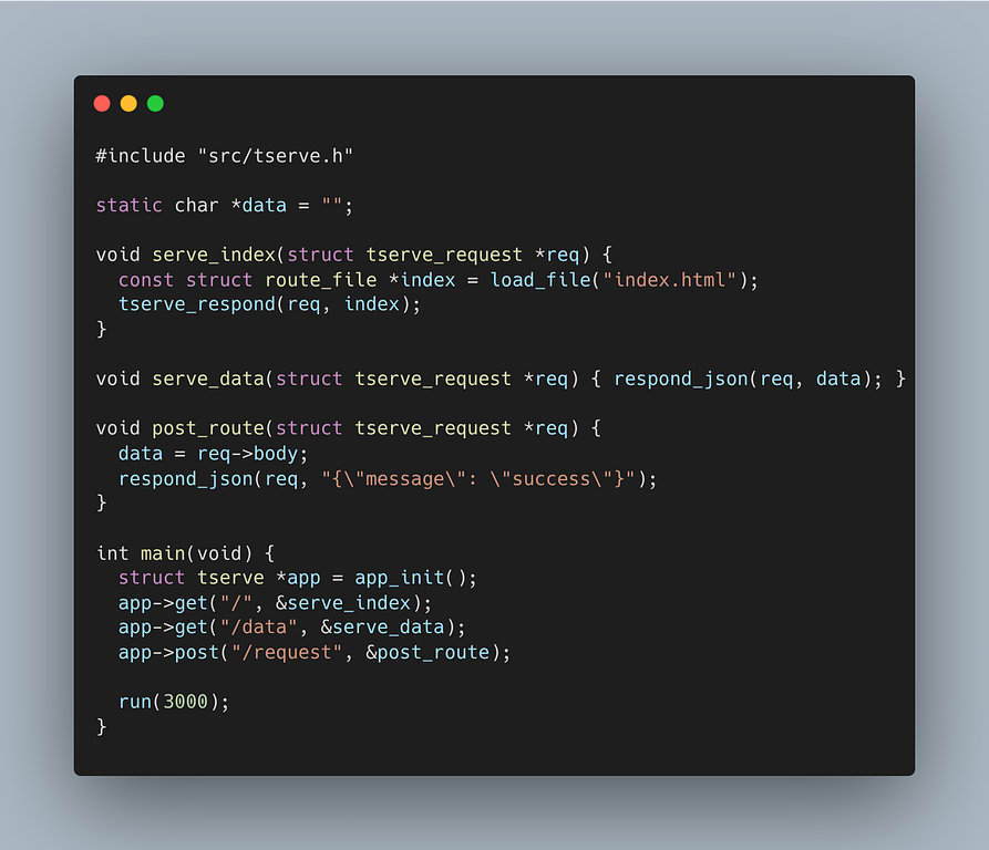 tserve is a tiny http server library, which is at its core a single-threaded epoll event loop. It supports only GET & POST requests, fortunately that's all you need.